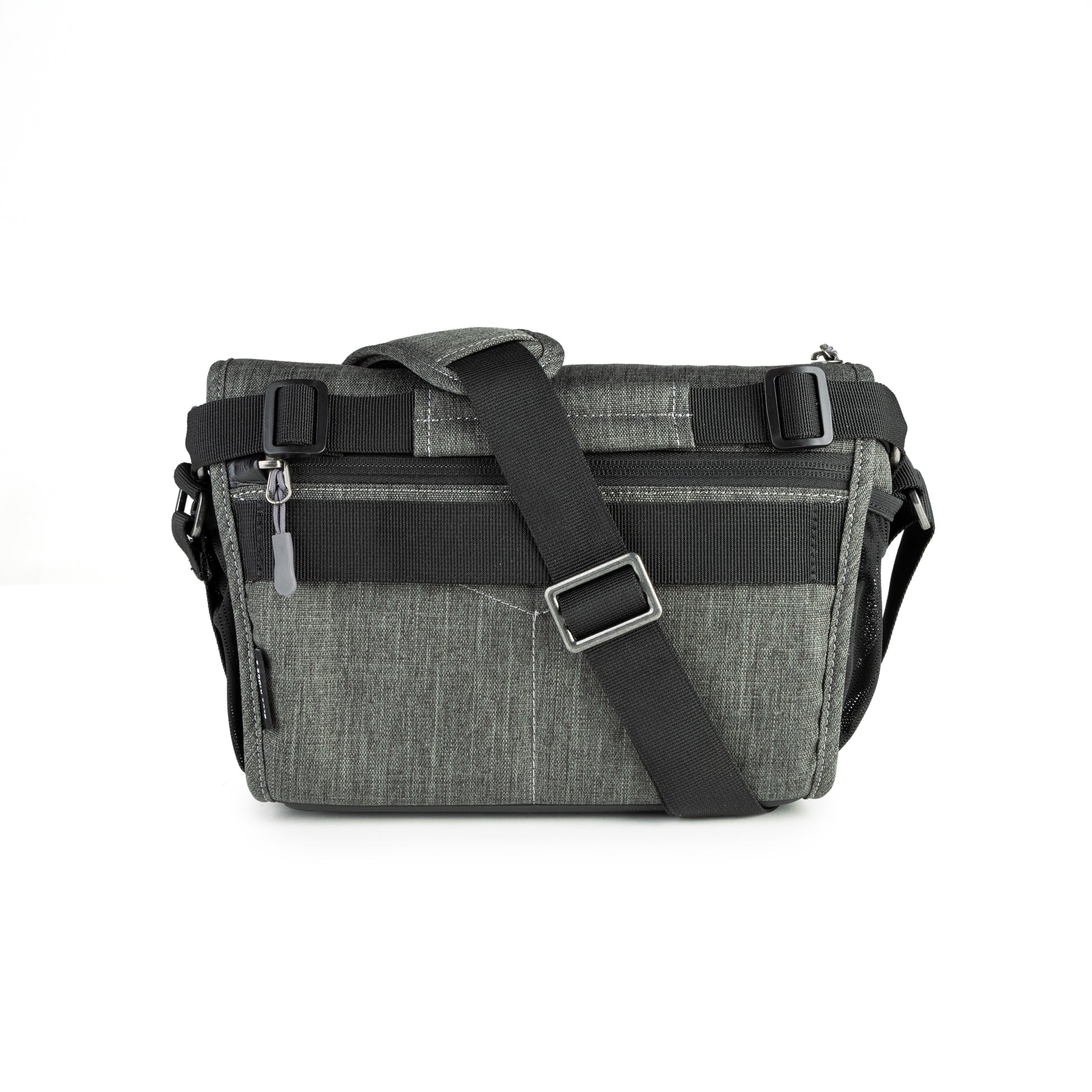 A beautiful, mottled green color, over-the-shoulder camera bag with lots of storage space for its size, and a nifty magnetic latch. This small size bag can hold a small mirrorless or DSLR camera with 1 or 2 lenses, speedlight, and accessories.