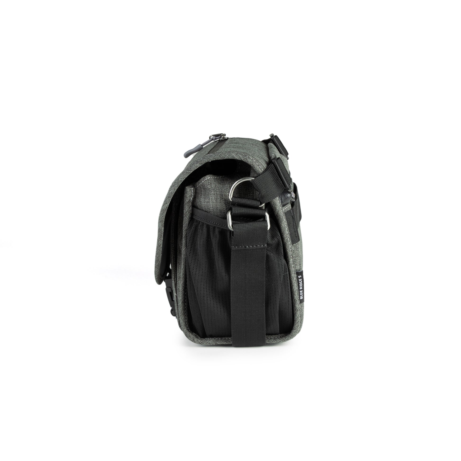 Within each Blue Ridge bag, you will find a light grey interior against which small items stand out, so they don't get lost at the bottom of the bag. The main interior compartment is customizable using movable dividers that provide cushioning. A pocket behind the main camera compartment is great for storing a small tablet or other flat item, and a separate, zippered front compartment has multiple pockets for organizing small items.