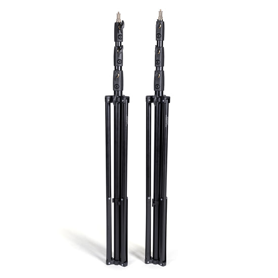 A matte black finish helps avoid unwanted glare and highlights during a shoot. Each stand is topped with a standard 5/8” stud with ¼”-20 threaded post. They achieve a 12’ working height but collapse down to just over 3.5’. A durable fabric case with dedicated sleeves for each stand and the crossbar sections rolls up for easy transport and compact storage.