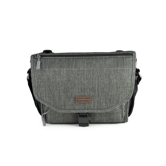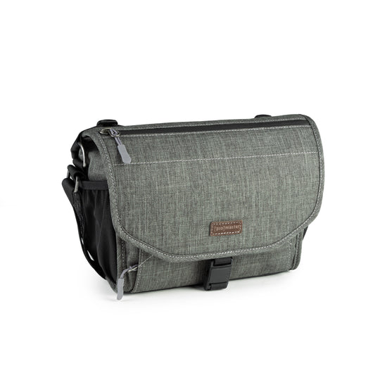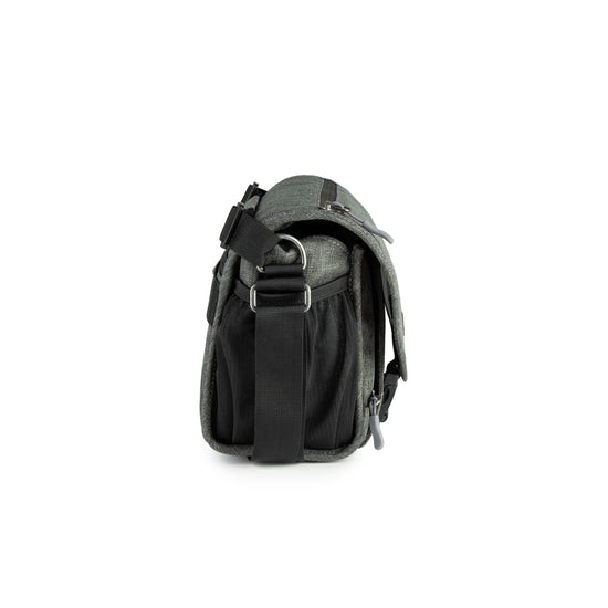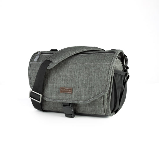 A beautiful, mottled green color, over-the-shoulder camera bag with lots of storage space for its size, and a nifty magnetic latch. This small size bag can hold a small mirrorless or DSLR camera with 1 or 2 lenses, speedlight, and accessories.